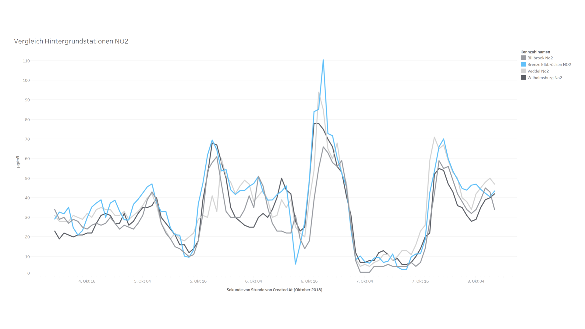 - Trendanalysen im Vergleich zu umliegenden Luftmessstationen: Bei längeren Installationen von Luftqualitätssensoren führen wir entsprechende Trendanalysen durch. Hierbei vergleichen wir die Verlaufskurven der städtischen Luftqualität wie sie von unseren Luftqualitätssensoren und von anderen stationären Luftmessstationen erfasst werden. Grafik 2 zeigt den Vergleich eines unserer Sensoren in Hamburg-Rothenburgsort mit den umliegenden öffentlichen Messstationen der Stadt Hamburg. Da die Messeinrichtungen eine gewisse Distanz voneinander entfernt sind, stimmen die Daten natürlich nicht zu 100% überein. Die Trends sind jedoch gleich.